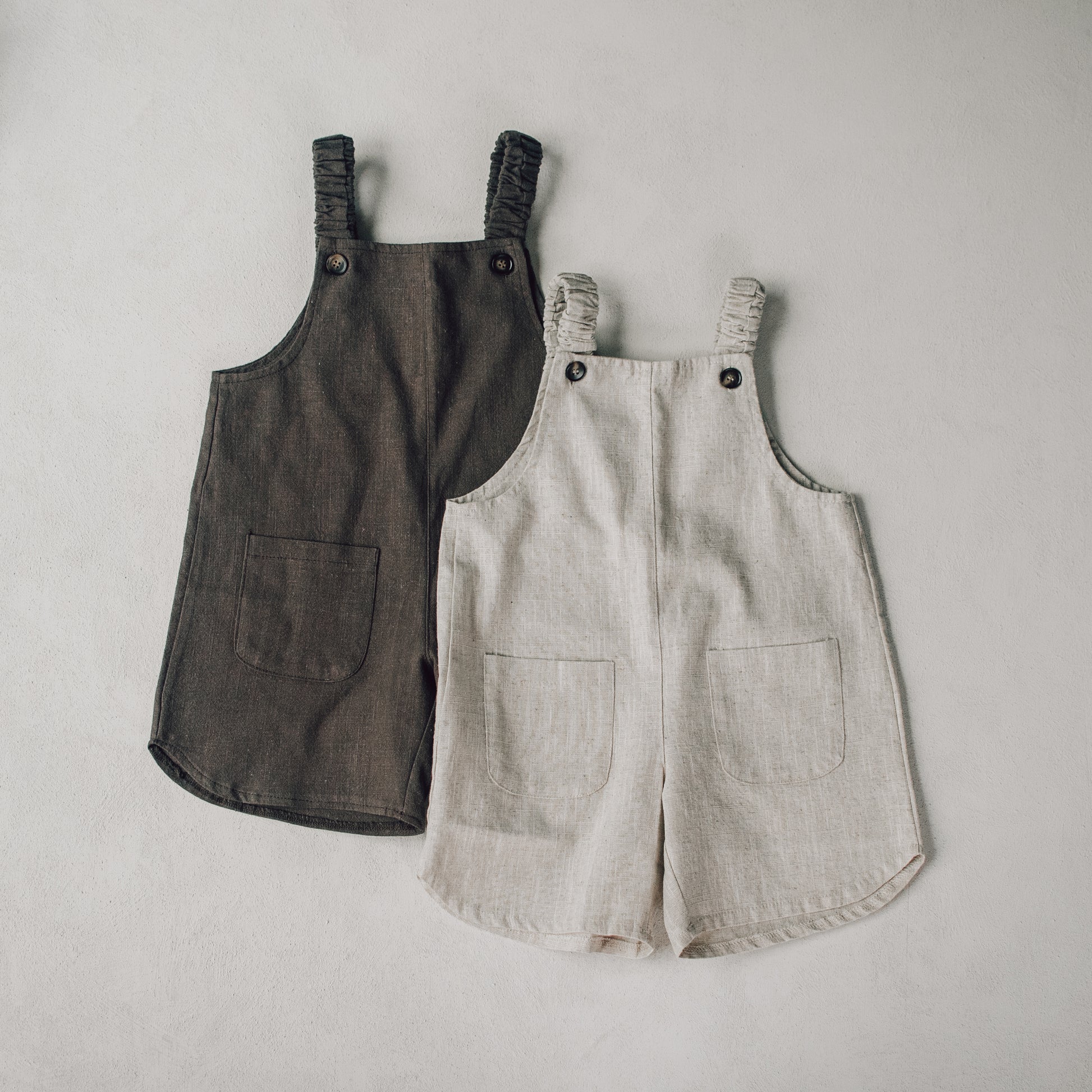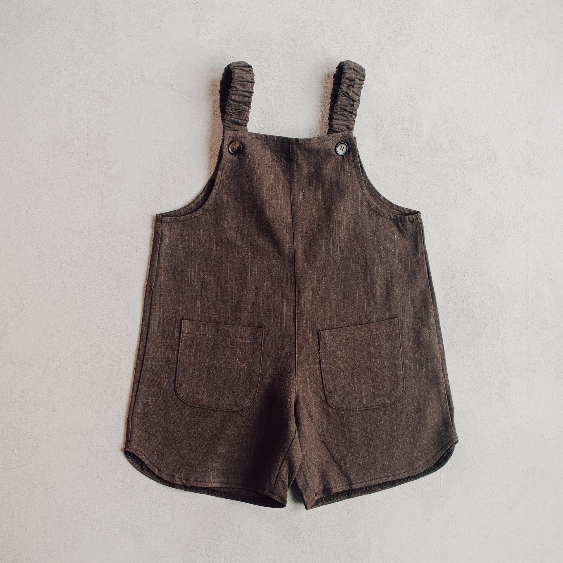 These breathable linen overalls feature adjustable button straps, front patch pockets, and a relaxed fit for all-day play. Available in two earthy tones – Cocoa and Oat – perfect for layering with a jumper or wearing solo on sunny days. Very oversized fit.