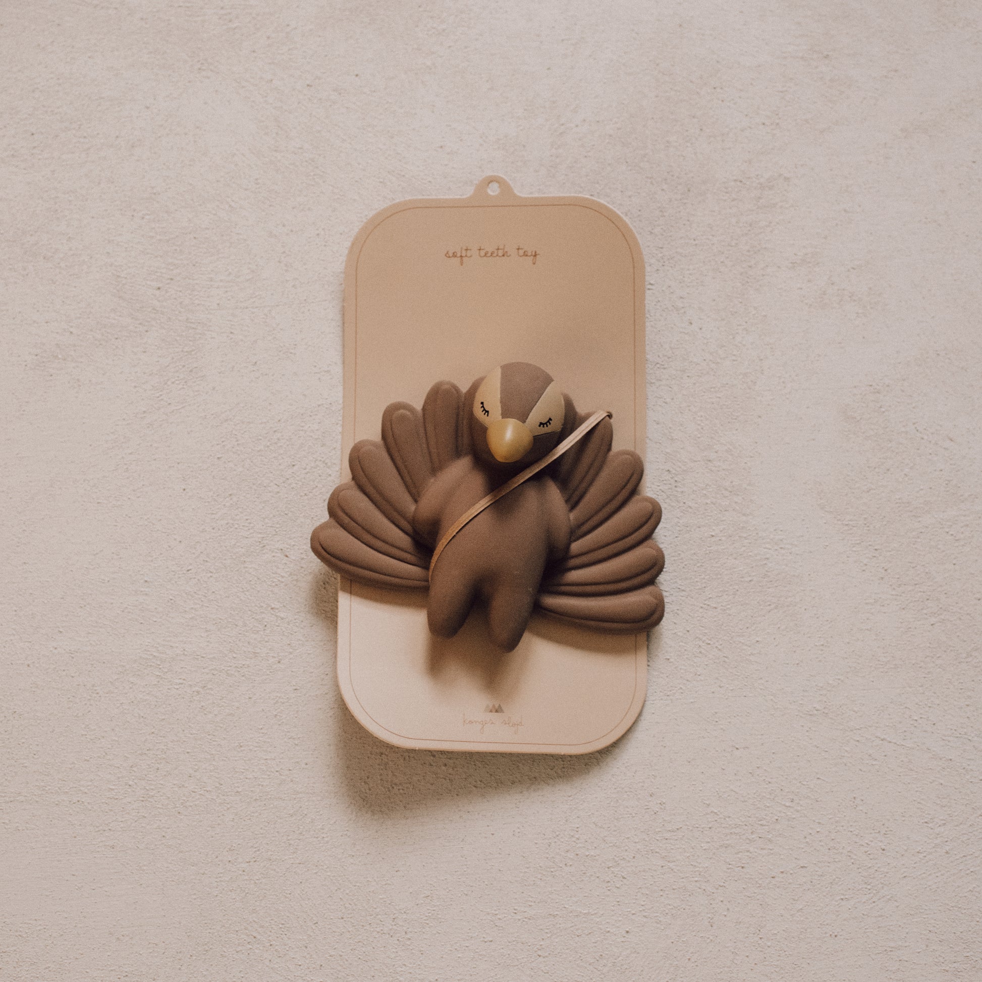 Soothe little gums with this beautifully crafted peacock teether, made from 100% natural rubber and free from harmful chemicals. Its soft, flexible texture is perfect for chewing, while the detailed shape makes it easy for tiny hands to hold.