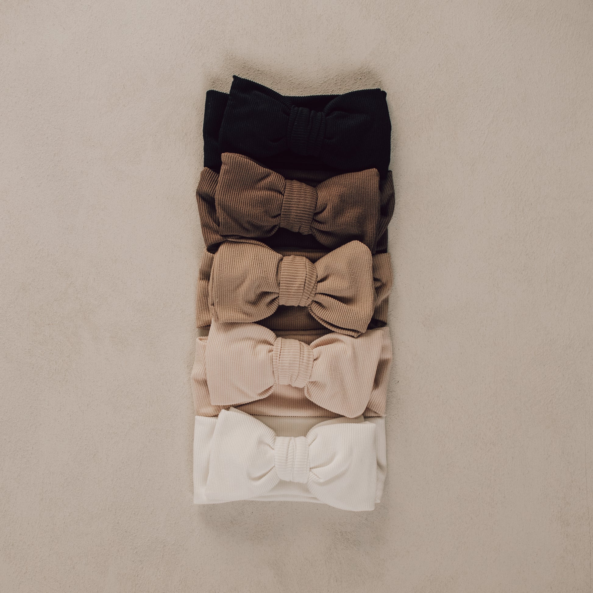 Soft, ribbed, double bow headbands. Quality thick material. Newborn to 3yrs approx fit.