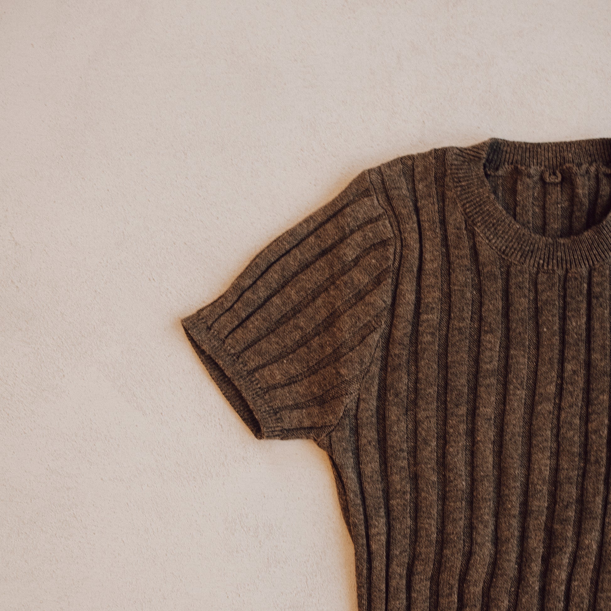 A beautifully crafted brown ribbed romper made from a fine, lightweight knit. Designed with short sleeves and poppers at the bottom for easy changes, it offers exceptional quality and comfort — perfect for everyday wear and warmer days.