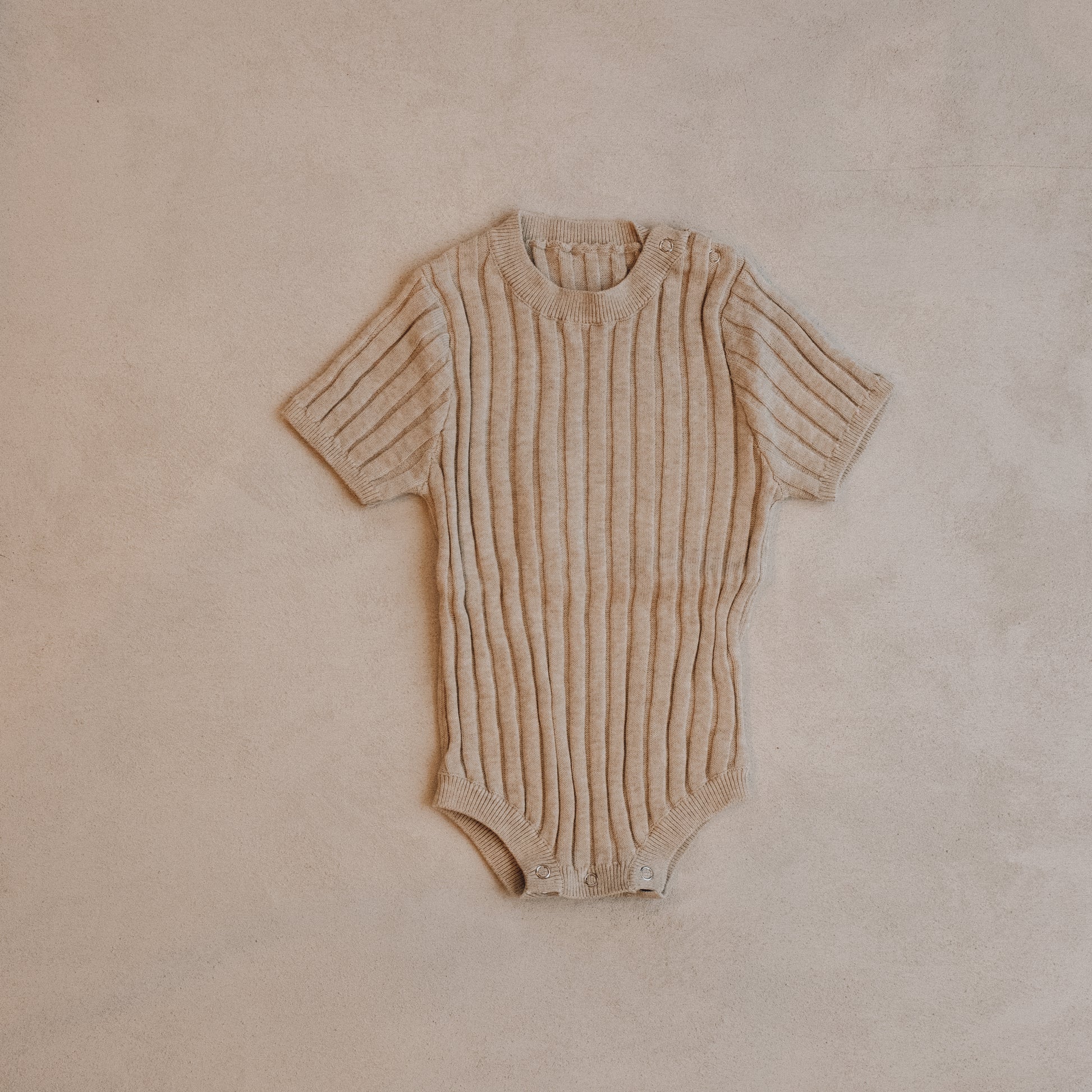 A beautifully crafted oatmeal creamy ribbed romper made from a fine, lightweight knit. Designed with short sleeves and poppers at the bottom for easy changes, it offers exceptional quality and comfort — perfect for everyday wear and warmer days.