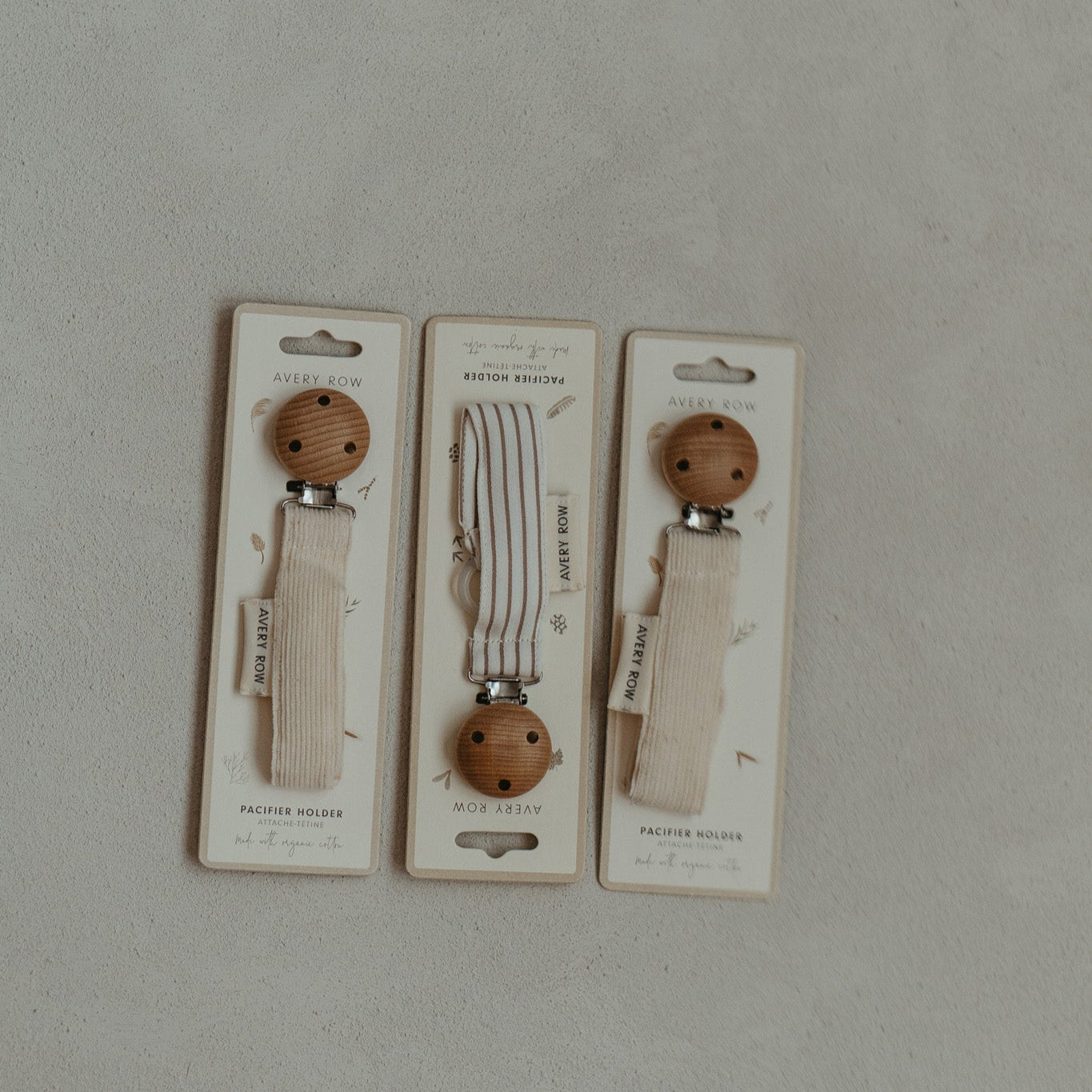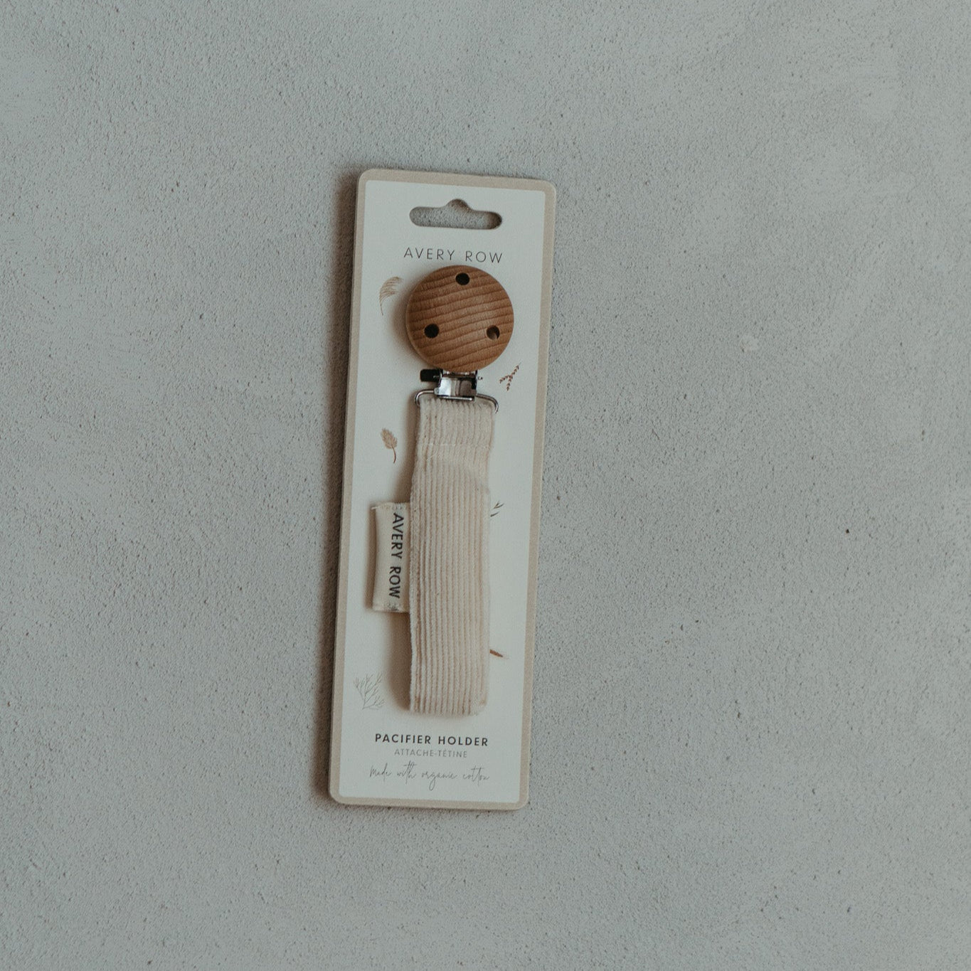 Classic and functional, this cream corduroy pacifier clip secures pacifiers within reach while adding a subtle touch of texture to any look.