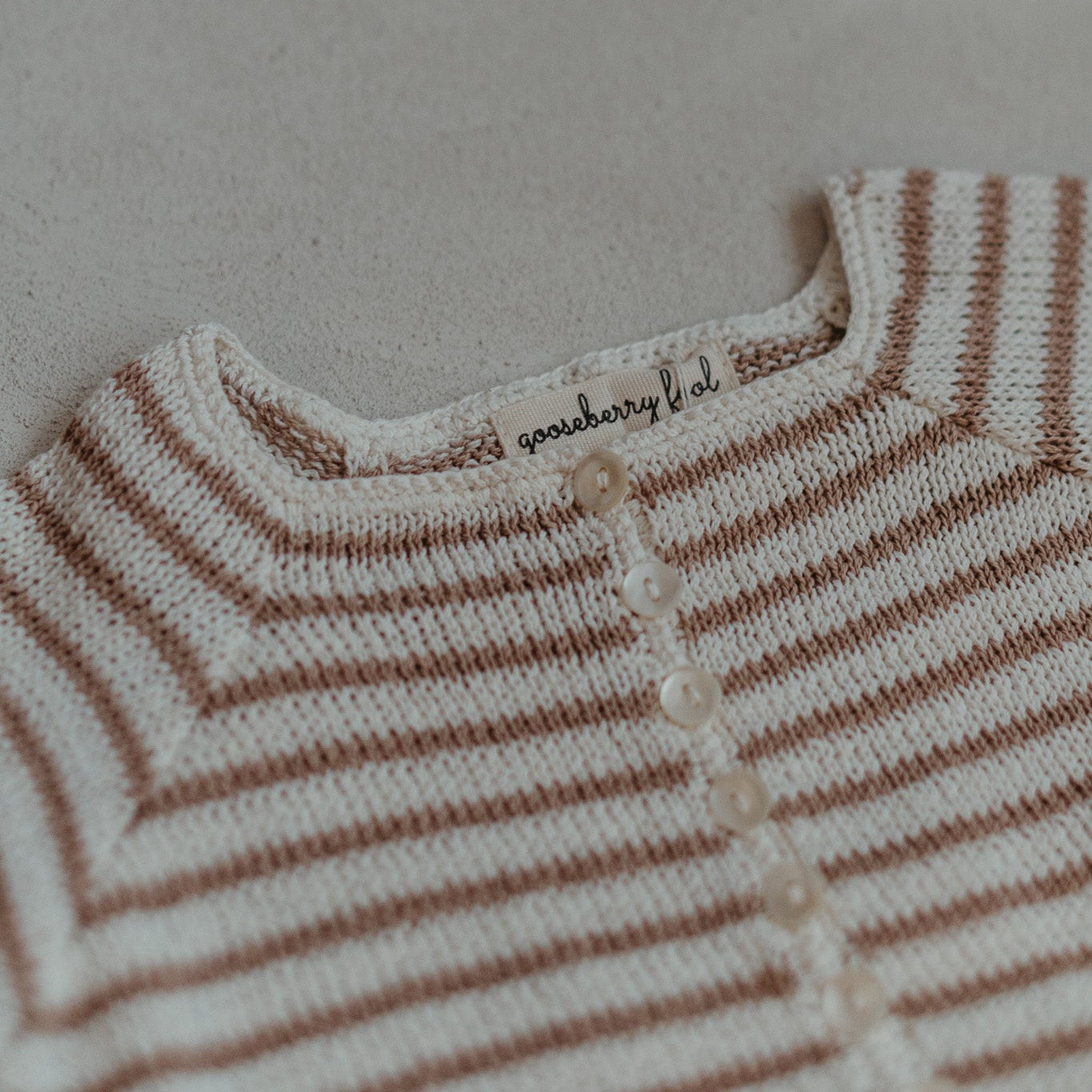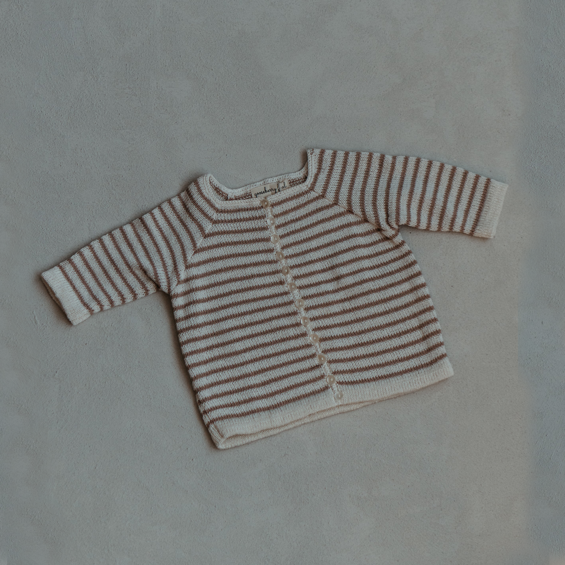Soft, cozy, and easy to layer, this cream and sand striped cardigan keeps little ones warm while adding a touch of timeless style.