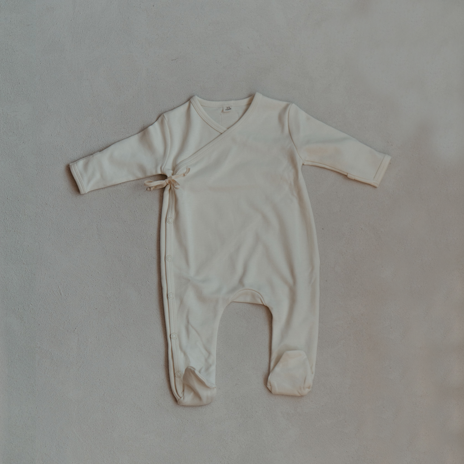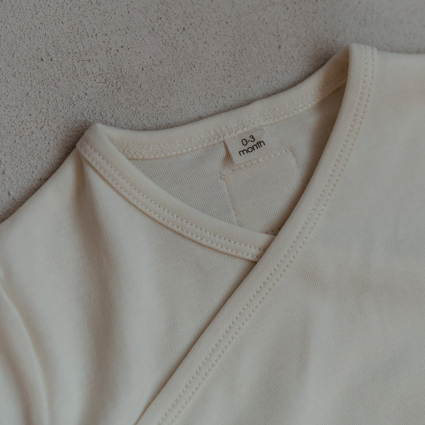 Soft and breathable, this ecru kimono-style bodysuit makes dressing easy with simple side ties and snap fastenings. A gentle everyday essential for newborns and beyond.
