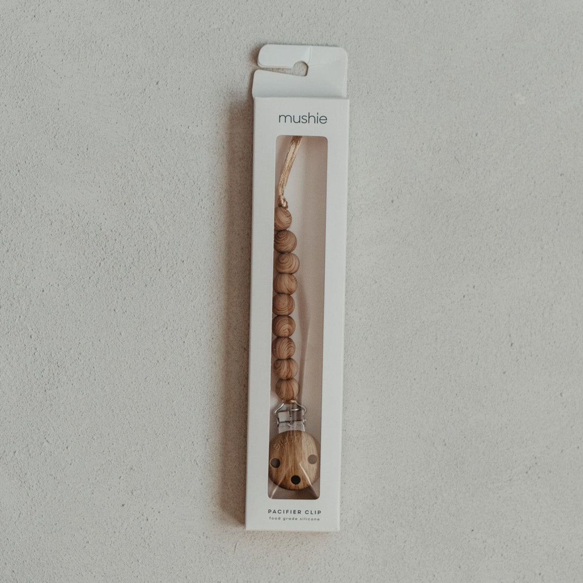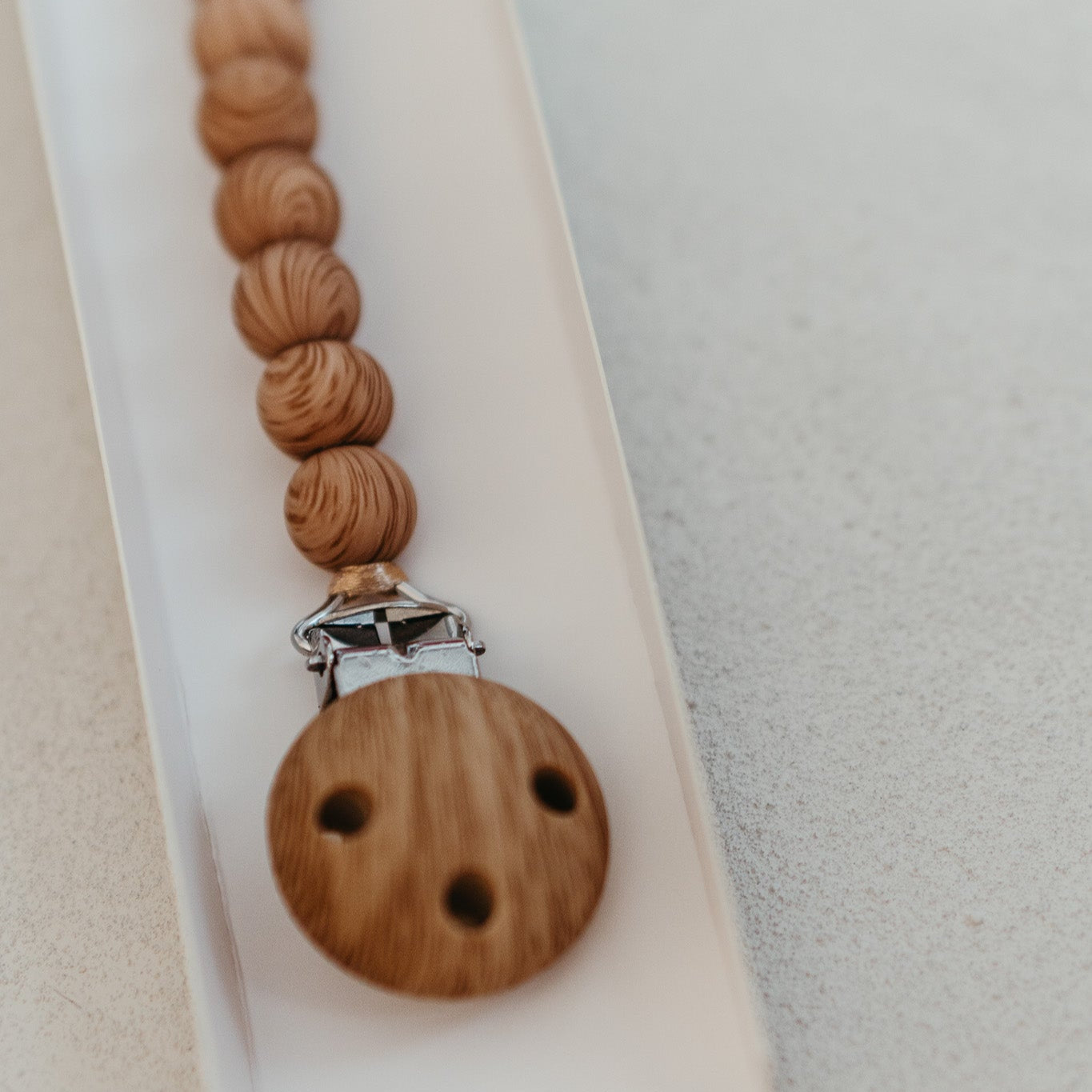 Simple and practical, this faux wood pacifier clip keeps pacifiers close at hand. Lightweight and easy to attach, it pairs seamlessly with any outfit or accessory.