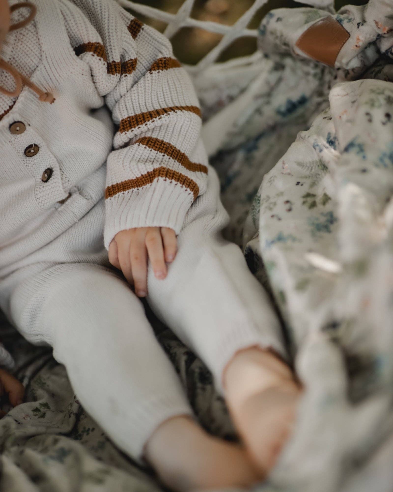 Really cute knitted braces with ribbons that can be crossed on the back. The material is delightfully soft and without scratching, which makes them comfortable to wear. The harnesses have a button closure with wooden buttons on the chest, which makes it easier for the child to put them on. The trouser legs are ribbed for a better fit.