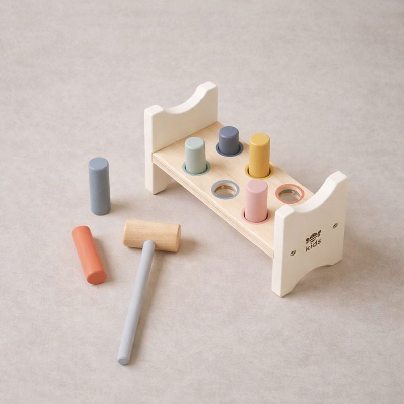 Be bold and introduce a little learner to their new favourite toy - this Just Bee Kids wooden hammer bench. Overflowing with educational benefits and crafted from wood and painted in soft rainbow hues, this hammer bench will help a little one to tire themselves out while they hone and develop their hand-eye coordination and fine motor skills. This set includes a smooth, easy-grip beater and six colourful pegs for little ones to grab and hammer into their holes and knock them back through.