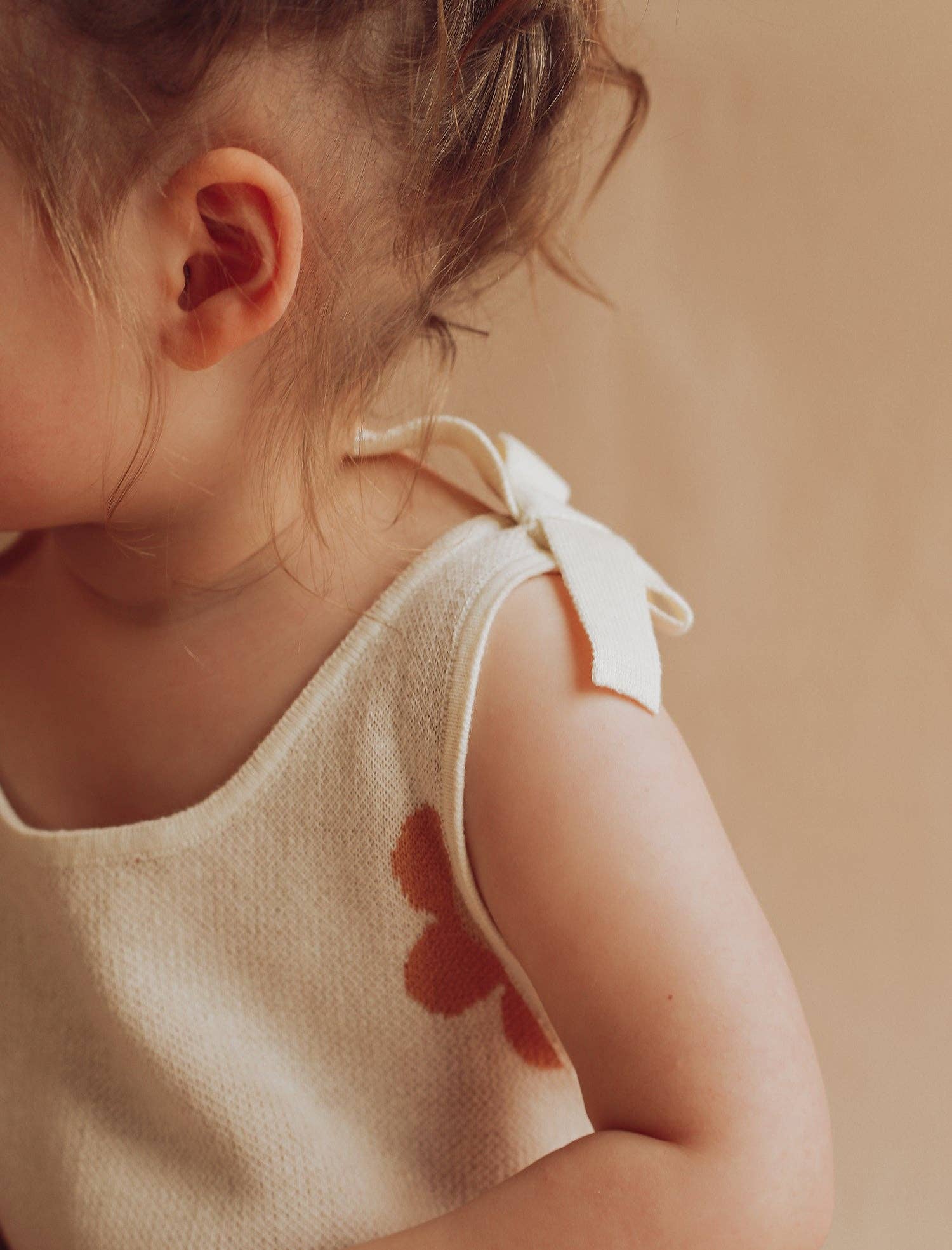 Knit summer romper with wild bloom pattern and fixed shoulder bows. Poppers for easy change. Relaxed loose fit. Size down for a more fitted look sizing comes up large.