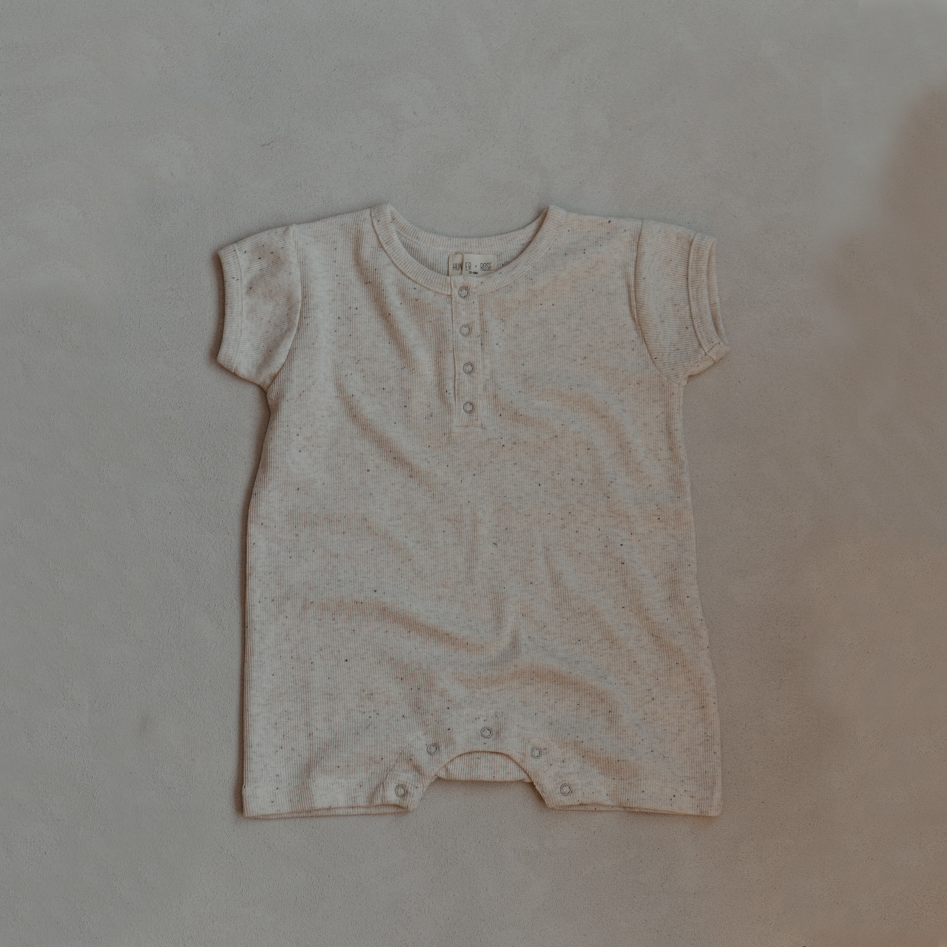A summer essential, this short-sleeved milk-flecked Jaxx romper is soft, breathable, and designed for all-day comfort. The all-in-one design makes dressing simple, while the subtle fleck pattern adds a touch of character.