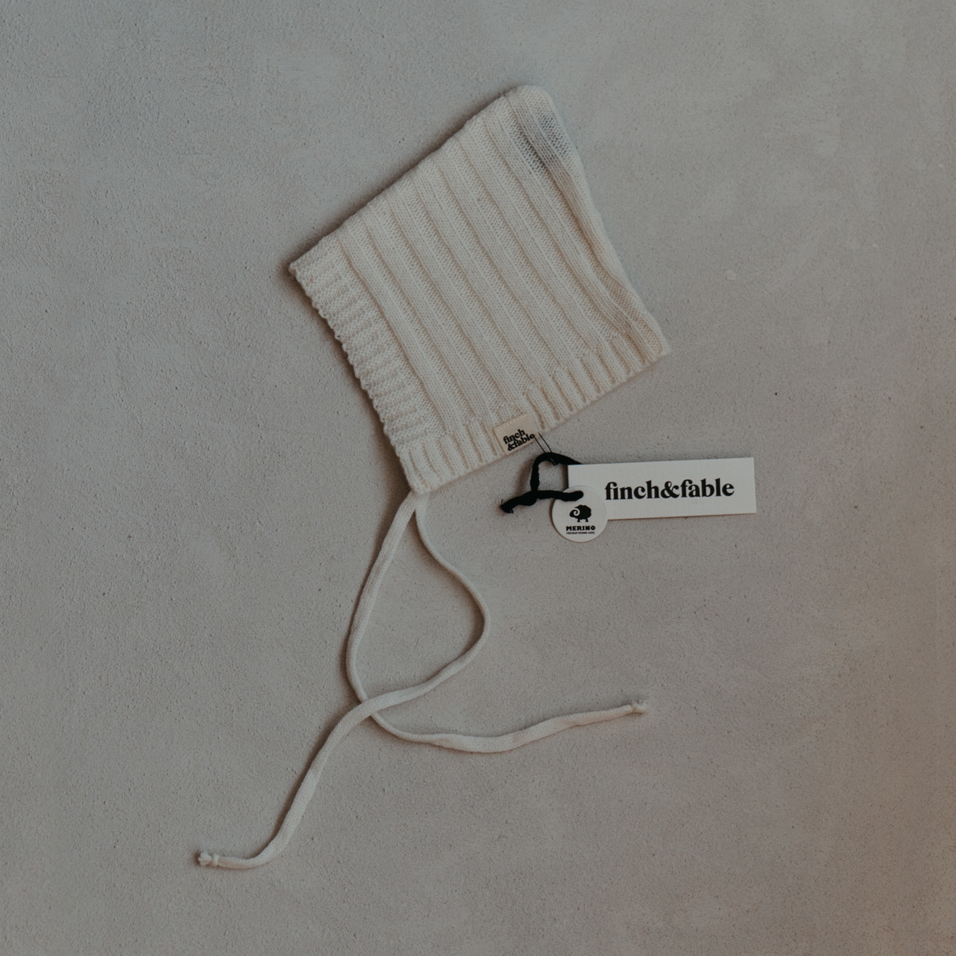 Designed for comfort and warmth, this milk wool knitted ribbed bonnet is soft, snug, and a simple way to keep little ones cozy all season.