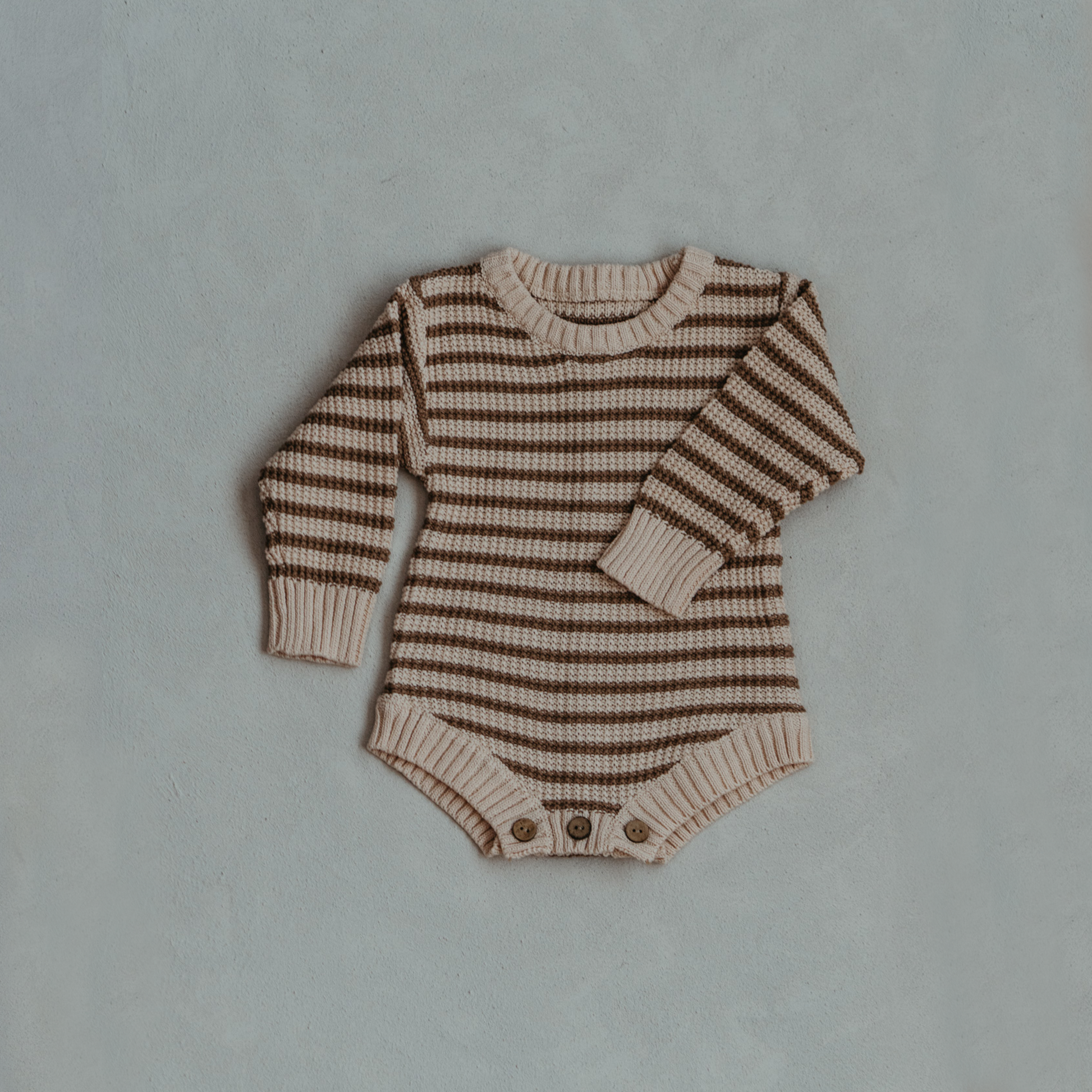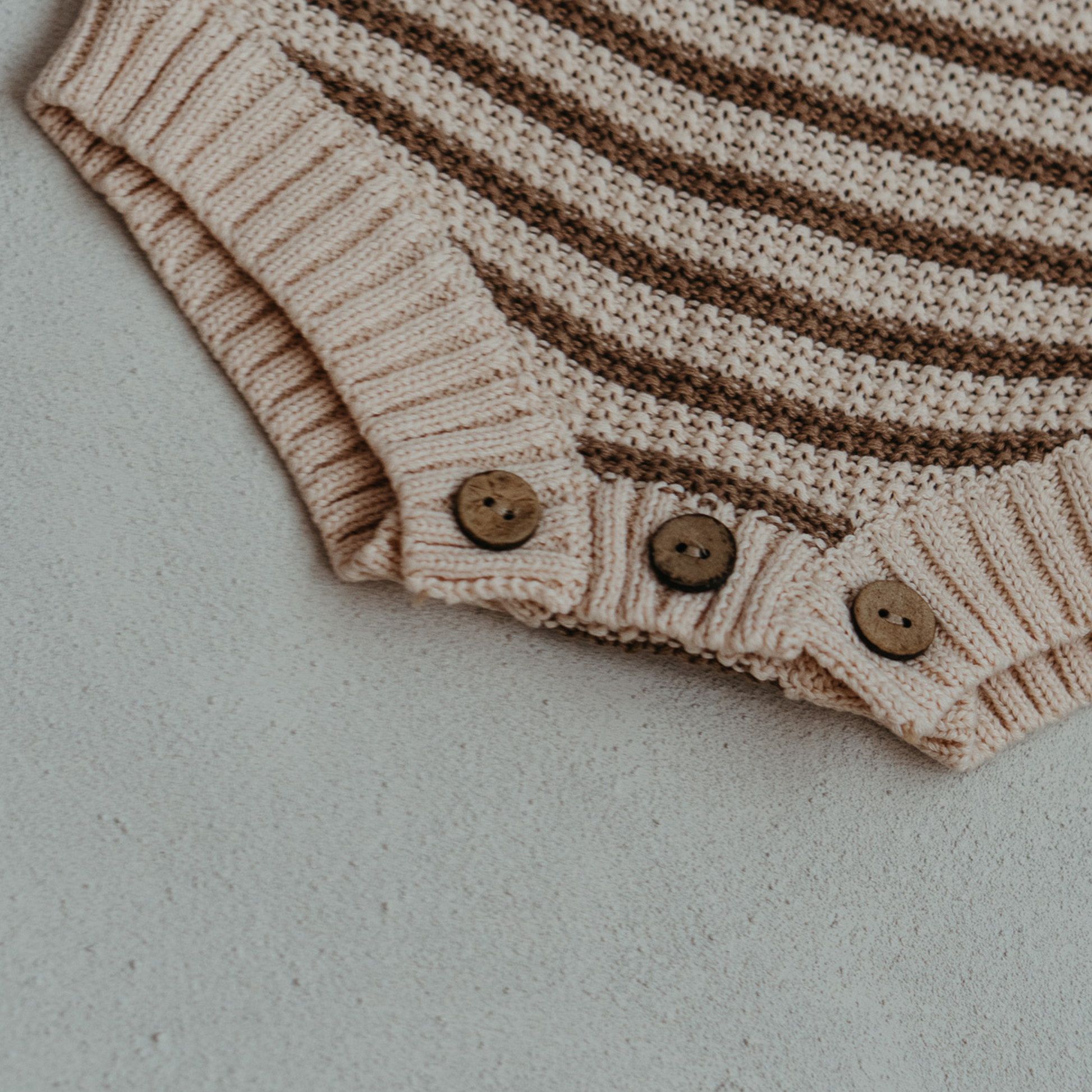 A cozy classic for your little one. This soft knitted romper features warm olive and oat stripes, a relaxed fit, and button closures for easy changes. Made with comfort and style in mind, it’s perfect for layering on cooler days or wearing solo for an effortlessly cute look.