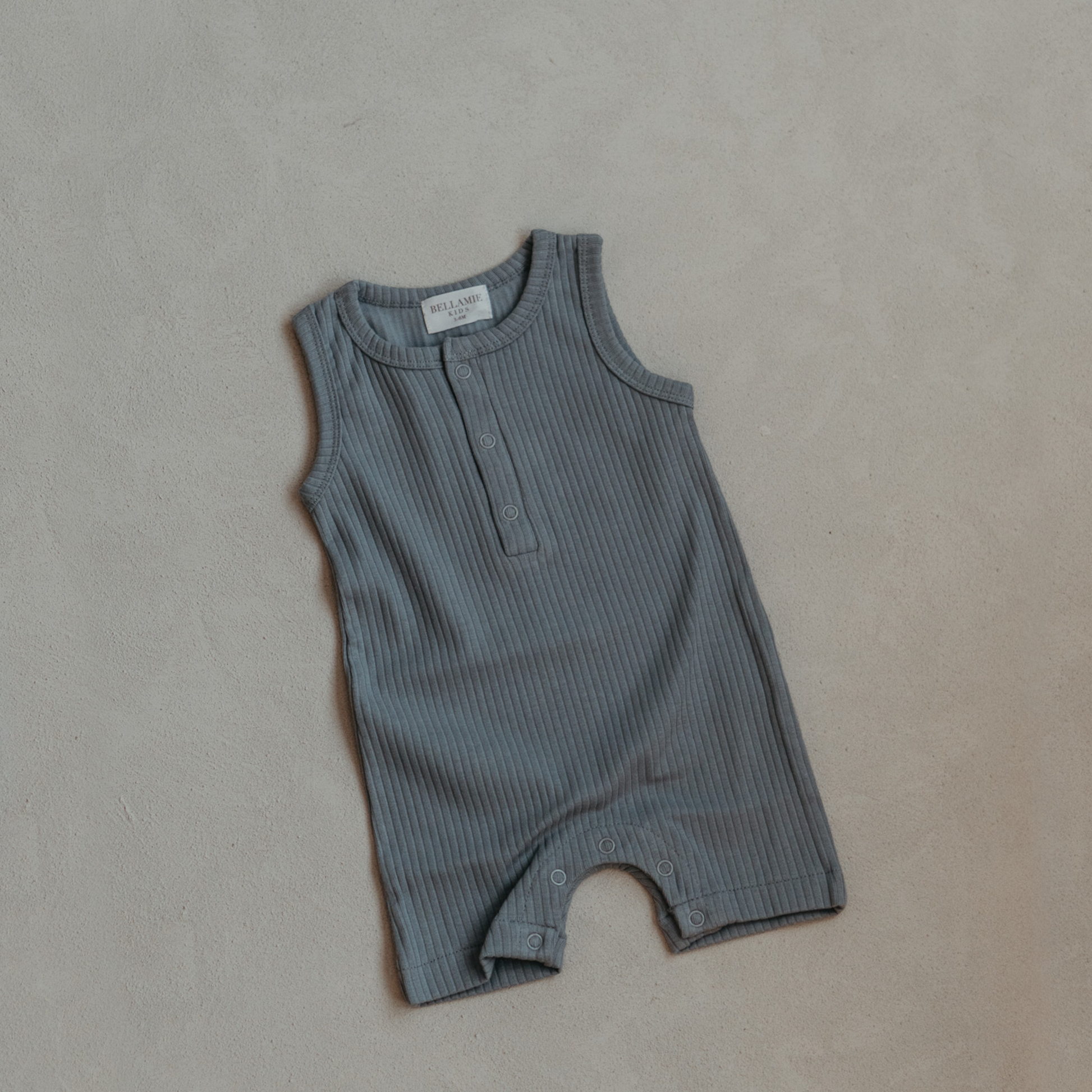 Crafted from soft ribbed fabric, this sleeveless romper in powder blue is simple, practical, and perfect for everyday wear or layering.