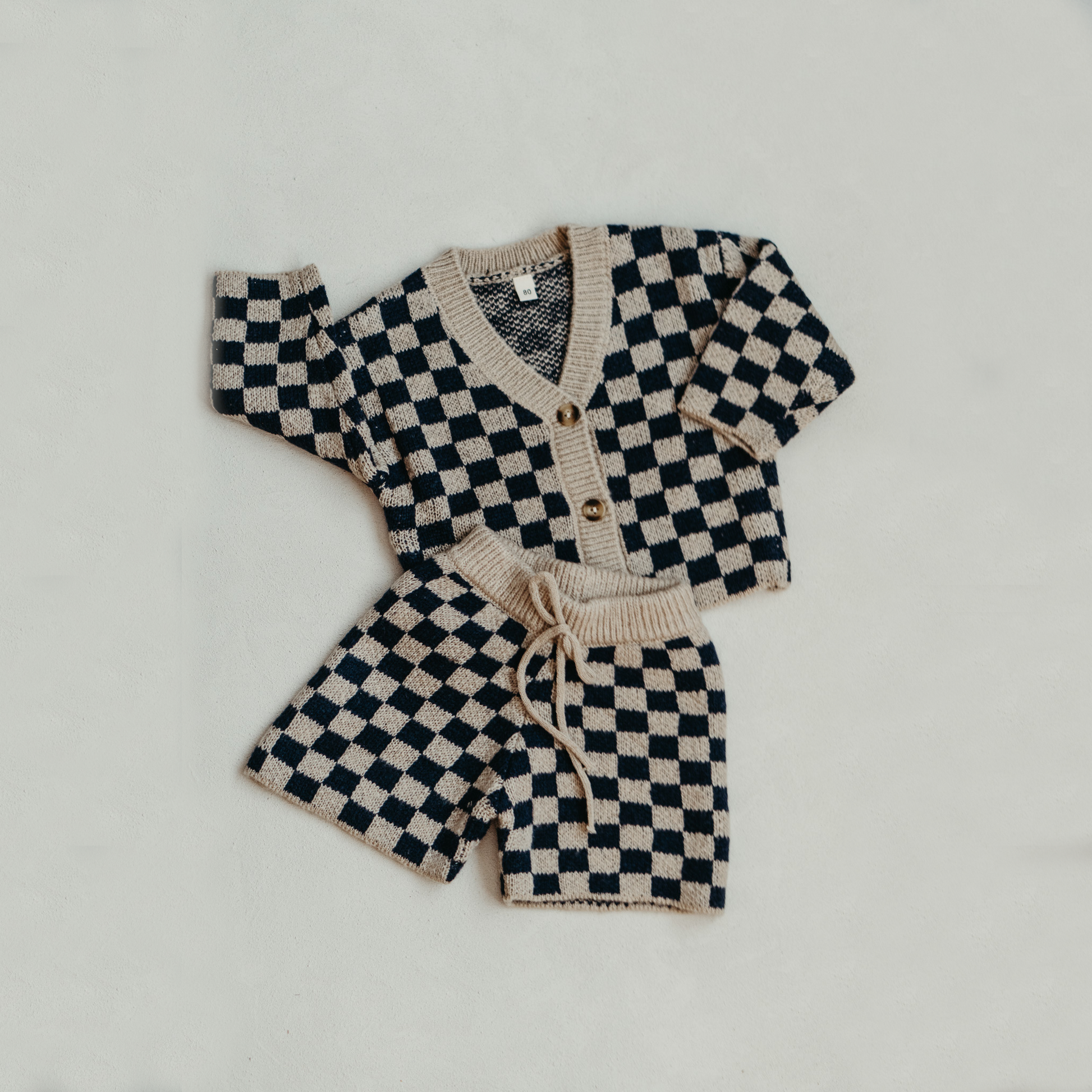 Bold and cozy, this checkerboard knit set features a soft button-up cardigan with matching shorts. The relaxed fit and playful pattern make it a great piece for everyday wear or special outings. Style together or mix and match for endless looks.
