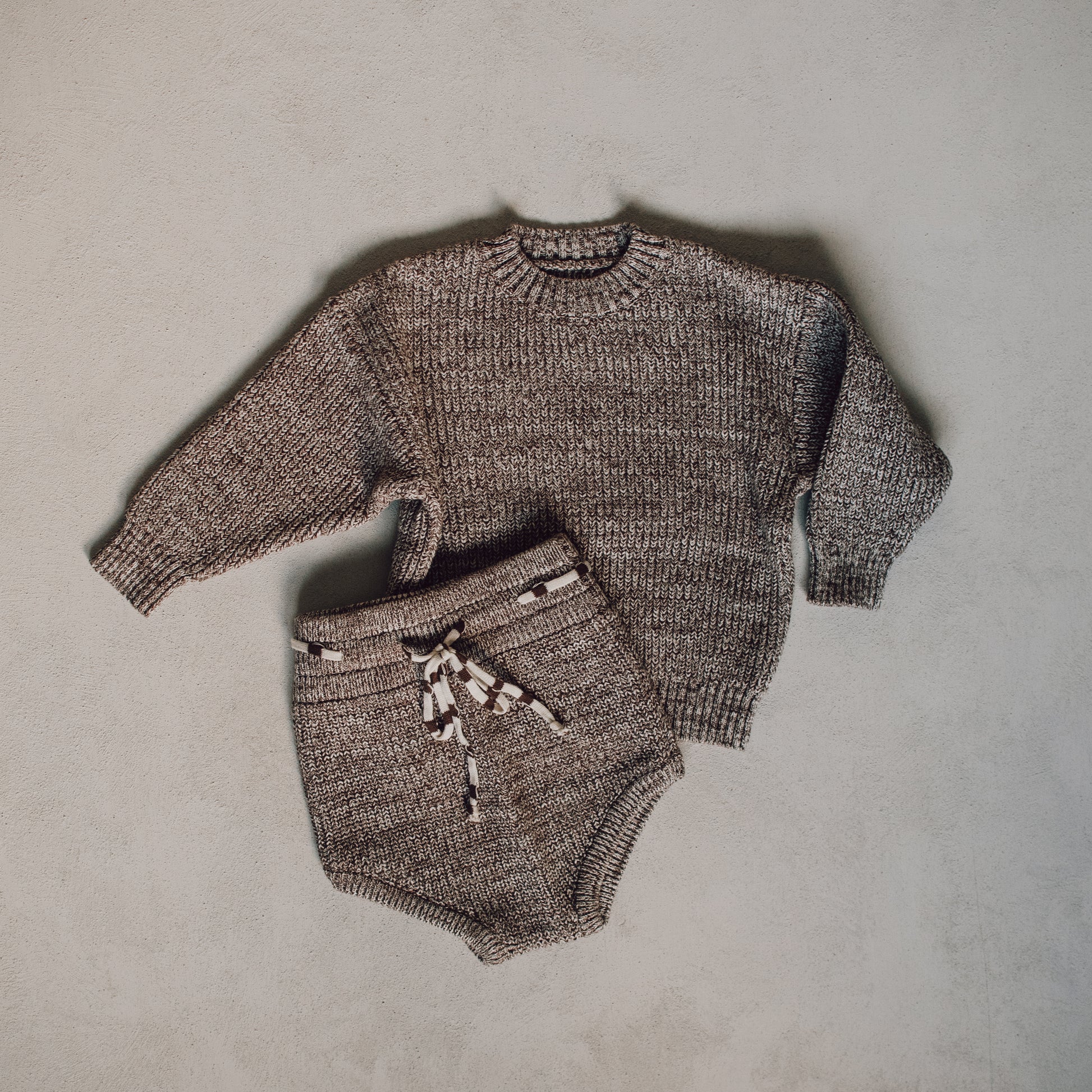 A soft knitted jumper and pants set in warm brown with subtle white flecks throughout. Designed for comfort and everyday wear, this cozy knit set offers a timeless, effortless look for your little one’s wardrobe.