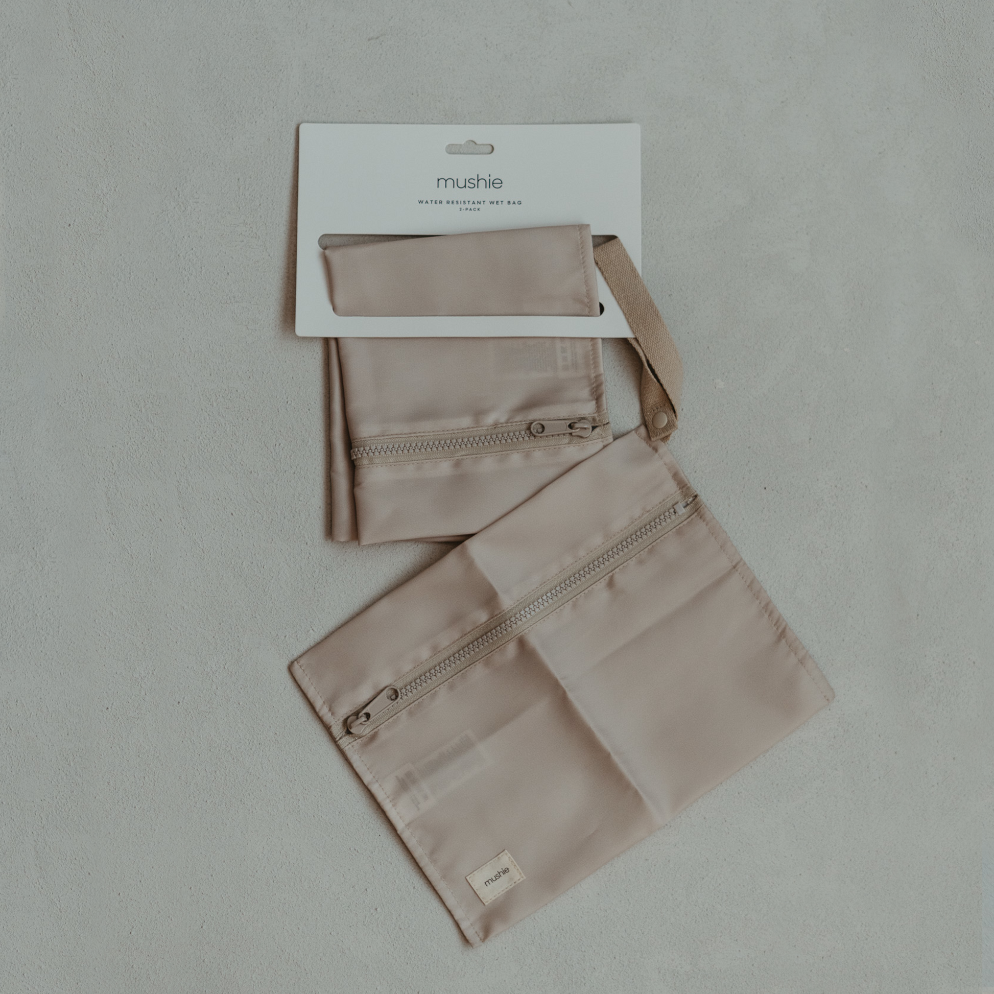 Practical and stylish, this beige wet bag keeps damp clothes or swimwear contained while on the go. Water-resistant and easy to clean, they come in 2 Medium & Small and are a must have for swimming lessons or beach days.